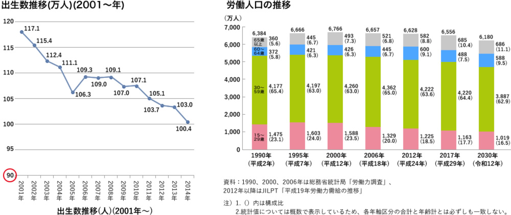 また、厚生労働省の厚生労働の基礎的資料では2030年の労働力人口(15歳~59歳)は、2012年に比較して448万人間性すると予測しています。