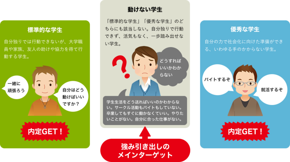 学生の多くは大学を卒業してから社会人となります。社会人としての規範や行動を身に着け、準備をすることを「社会化」といいます。「優秀な学生」「標準的な学生」は次第に社会化をしていく一方で、「動けない学生」の社会化に向けて、どのように取り組むかが喫緊の課題です。