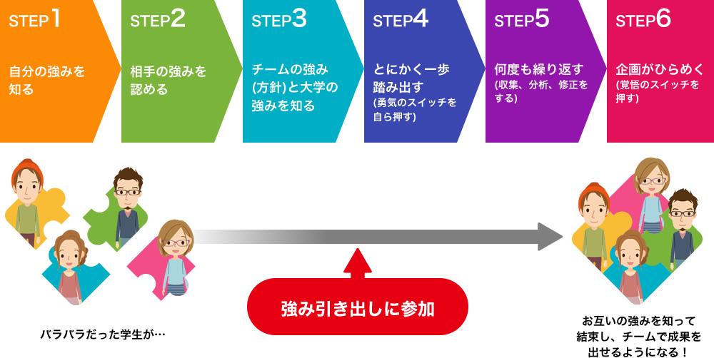 「強み引き出し」では、まず一人ひとりの強みを引き出すことで、自分の本来の魅力や持ち味に気づかせ個々の自信を取り戻します。また、周囲の人や教授・職員、チームの強みを認めさせることで、組織の方針に従いつつ一歩踏み出すための勇気のスイッチを押す支援をします。さらに、小さな失敗を恐れずに行動を繰り返してもらうことで、仲間と協力し合いながら目標達成できる人材を育成します。