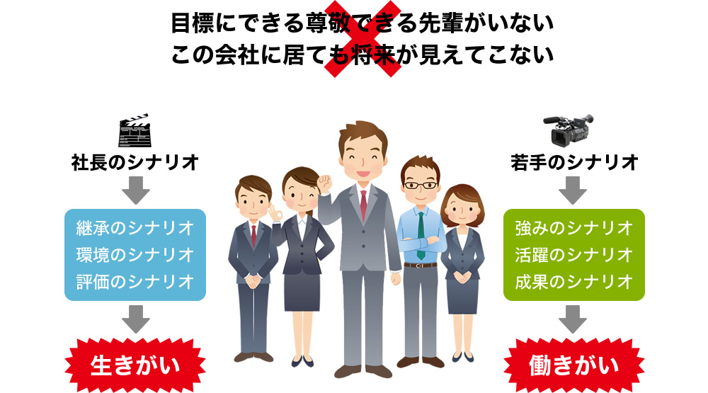 若手が育たないと悩んでいる社長様達へ優秀な若い社員が入社してもいつの間にか気が付くと辞めている。その繰り返しに苦しめられている社長達。採用に時間とお金をかけても結局は辞めてしまう現実の厳しさ。辞めて行く彼らが口を揃えて言う言葉 ①目標にできる尊敬できる先輩がいない ②この会社に居ても将来が見えてこない。